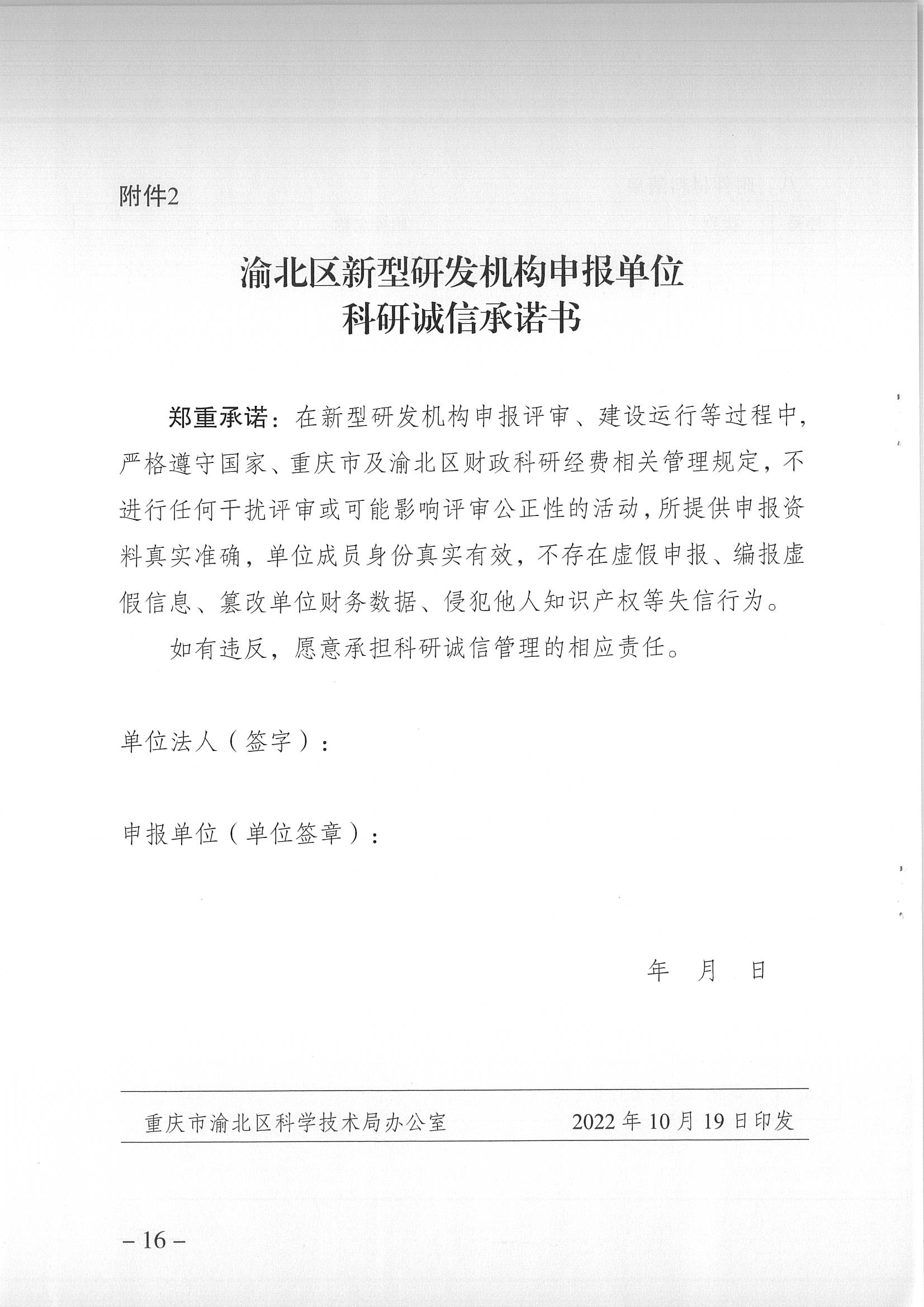 2.渝北区新型研发机构申报单位科研诚信承诺书