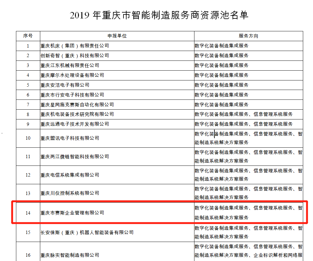 纳入2020年重庆市智能制造服务商资源池